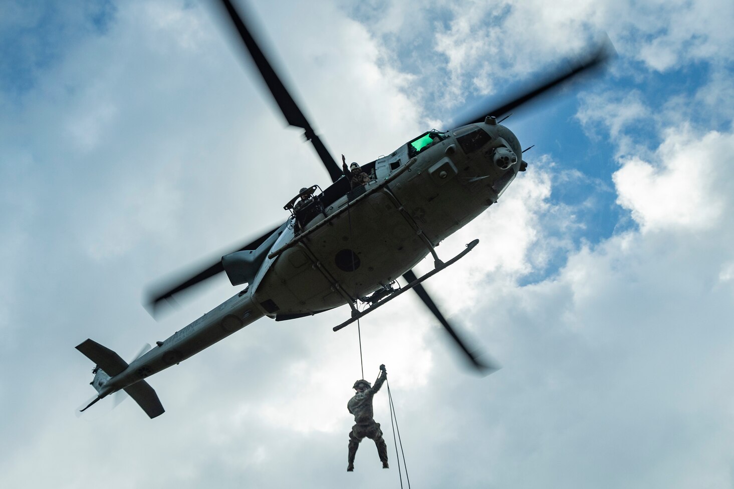 U.S. Marines with III Marine Expeditionary Force rappel from a UH-1Y Venom assigned to Marine Light Attack Helicopter Squadron 169 during special patrol insertion and extraction training at Landing Zone Starling, Camp Schwab, Okinawa, Japan, Sept. 21, 2023. Helicopter rope suspension techniques teach Marines proper knots, rappelling techniques and build confidence for maneuvering from air to ground. (U.S. Marine Corps photo by Cpl. Tyler Andrews)