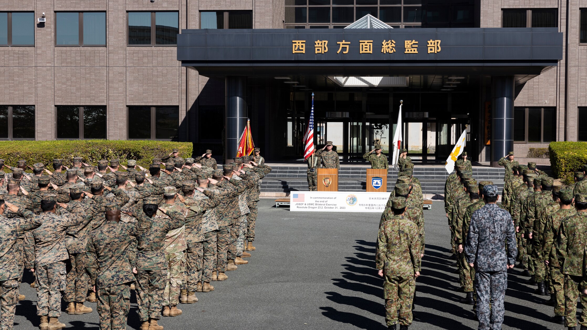 Members of the U.S. Armed Forces and Japan Self-Defense Force salute while in formation during the closing ceremony for the field training exercise portion of Resolute Dragon 23 held at Japan Ground Self-Defense Force Camp Kengun, Kumamoto, Japan, Oct. 31, 2023. RD 23 is an annual bilateral exercise in Japan that strengthens the command, control, and multi-domain maneuver capabilities of Marines in III Marine Expeditionary Force and allied JSDF personnel. (U.S. Marine Corps photo by Staff Sgt. Robert G. Gavaldon)